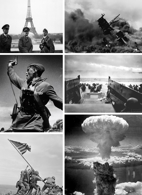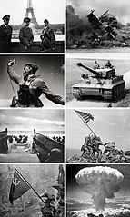Русский: Коллаж фотографий времён Второй мировой войны. Левый столбик (сверху вниз): Гитлер на фоне Эйфелевой башни, июнь 1940 года; фотография Макса Альперта «Комбат» — советский офицер поднимает бойцов в атаку, июль 1942 года; высадка войск американской 1-й пехотной дивизии на пляже «Омаха», 6 июня 1944 года; установка советского знамени на крыше рейхстага, май 1945 года. Правый столбик (сверху вниз): тонущий американский линкор «Аризона» после нападения на Перл-Харбор, 7 декабря 1941 года; немецкий танк «Тигр» в северной Франции, март 1944 года; водружение флага над Иводзимой 23 февраля 1945 года; ядерный гриб над Нагасаки, 9 августа 1945 года. Deutsch: Collage. Linke Spalte (von oben nach unten): Hitler vor dem Eiffelturm, Juni 1940; sowjetischer Offizier, der Truppen zum Angriff anfeuert, Juli 1942; Landung der amerikanischen 1. Infanteriedivision am "Omaha Beach", 6. Juni 1944; Hissen der sowjetischen Flagge auf dem Reichstag, Mai 1945. Rechte Spalte (von oben nach unten): Versenkung des Schlachtschiffs Arizona in Pearl Harbor, 7. Dezember 1941; deutscher Tiger-Panzer in Nordfrankreich, März 1944; Hissen der amerikanischen Flagge über Iwo Jima, 23. Februar 1945; Atompilz über Nagasaki, 9. August 1945. |