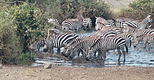 Häufig kommen Herdenbildungen mit anderen pflanzenfressenden Tierarten vor, beispielsweise mit Gnus, Leierantilopen, Wasserböcken und Impalas. Solche Großverbände verschiedener Tierarten formieren sich meist gegen Ende der Regenzeit.[1]