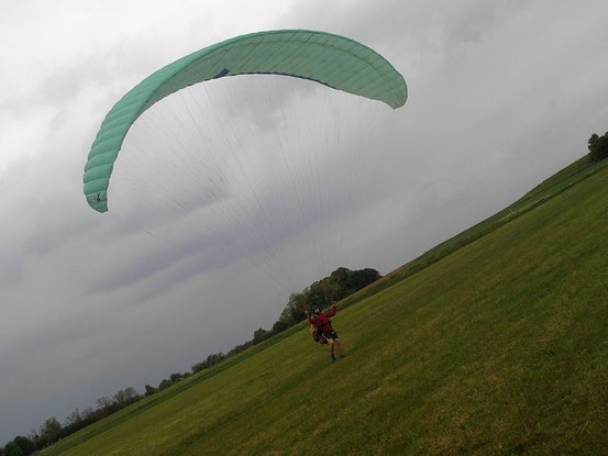 In seiner Freizeit geht Lukas oft Gleitschirmfliegen. Die dazu nötige Ausrüstung besitzt er selbst und als ich ihn frage ob er mich mal mitnehmen wolle willigt er sofort ein. Meine ersten Übungsstunden habe ich am Tallheimer Steinbruch (Raum Schwäbisch Hall), die mit einem Flug über den geschätzt gute 70 Meter Steilhang enden. Die Steuerung des Drachens habe ich dabei schnell heraus, da ich bereits mit einem ähnlichen wakeboarden war und auch an die individuelle Haptik seiner 2 Drachen habe ich mich schnell gewöhnt.