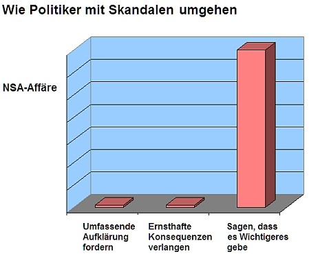 Kurz vor der Krimkrise war die NSA-Affäre noch eines der Topthemen der deutschen Politik. Am Besten trifft die folgende Grafik die Befindlichkeit der deutschen Bevölkerung und ihr Eindruck vom Verhalten der deutschen Regierung: