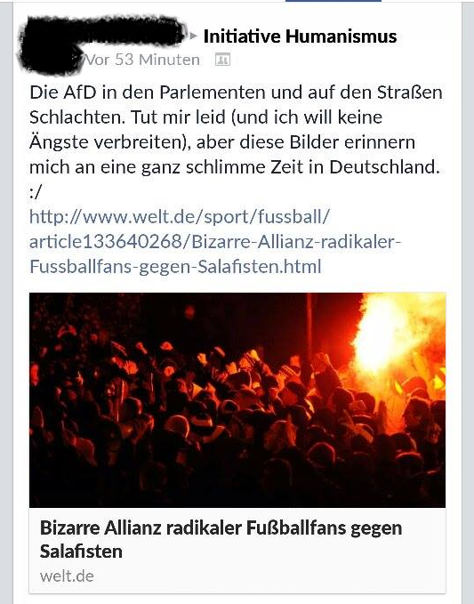 Die einen meinen wir werden von Islamisten überrollt, die anderen von Nationalsozialisten. Ich meine, unsere Demokratie ist wehrhafter und damit auch faschismusresistenter als viele glauben. Fünf bis achttausend gewaltbereite Rechtsradikale leben in Deutschland, das entspricht 0,008 % der Gesamtbevölkerung. Salatfisten machen mit drei- bis fünftausend 0,005% der Deutschen aus. Bedenkt man, dass die prozentuale Anzahl der Muslime in Deutschland auf 2 bis 4,5 Millionen geschätzt wird, wirkt auch das Bild von der Islamisierung Deutschlands überzeichnet.
