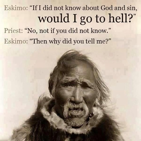 Dann stellt sich mir noch die Frage, ob Behinderte etc. in den Himmel kommen, wenn sie doch gar nicht verstehen können, was es heißt Jesus bewusst und willentlich anzunehmen. Die Bibel spricht hier eine klare Sprache: Niemand kommt zum Vater denn durch mich. Mit Gerechtigkeit hat das Ausgrenzen von intellektuell Minderbemittelten aber freilich überhaupt gar nichts zu tun. Oder haben sie ein „Freiticket“? Ist das nicht auch wieder ungerecht, weil auch ich kognitiv zu begrenzt bin, um zu erkennen welcher Gott unter den Tausenden der Richtige ist bzw. wen von denen ich anbeten muss, um in den Himmel zu gelangen? Wie steht es um einen Chinesen, der sein ganzes Leben lang nichts vom „richtigen“ Gott erfährt? Wird er vor den Himmelspforten abgewiesen? Steht es für ihn von Anfang an fest, dass er nicht in den Himmel kommt, weil er im falschen Land (oder wie ein Azteke zur falschen Zeit) geboren worden ist? Schützt Unwissenheit vielleicht wenigstens vor der Hölle? Wenn nicht, ist Missionsarbeit nicht wortwörtlich brandgefährlich?