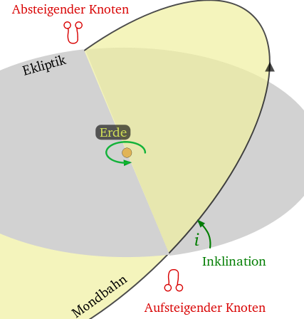 Damit ist es aber noch nicht getan, ansonsten würde sich ja bei jedem Neumond, das passiert circa einmal im Monat, die Sonne verdunkeln. Es bedarf noch einer zweiten Voraussetzung und die hat etwas damit zu tun, dass Erde und Mond sich nicht nur zwei- sondern dreidimensional im Raum bewegen: Normalerweise ist die Bahn des Mondes um 5° gegenüber der Bahn der Erde, der Ekliptik, geneigt, was verhindert, dass Erde, Mond und Sonne allmonatlich in einer Linie hintereinander stehen. Also muss der Mond zusätzlich die Umlaufbahn der Erde schneiden, um die Sonne auch tatsächlich zu verdunkeln. Eine Sonnenfinsternis erleben wir demzufolge dann und nur dann, wenn Neumond ist UND dieser die Erdekliptik schneidet, zusammen kommen diese beiden Faktoren nicht mehr so oft vor wie einzeln, und deswegen ist eine Mondfinsternis auch so selten. Von diesen Schnittpunkten, im Fachjargon nennt man sie Mondknoten, gibt es logischerweise zwei: