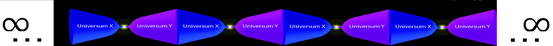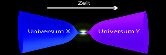 Stringtheorie: Die Stringtheorie löst das Singularitätsproblem mit eindimensionalen Energiefäden. Außerdem kommt sie mit elf, anstatt mit den üblichen drei Raumdimensionen einher. Das ermöglicht eine ganz neue Interpretation des Big-Bounce: Kurz vor selbigem driftete unser Universum durch ein höherdimensionales Metauniversum. Mit ihm driftete noch ein zweites, "normales " Universum durch den Hyperraum und begann allmählich unsere Welt gravitativ anzuziehen. Die beiden Universen kamen sich näher und näher, verschlangen sich und wurden unter den enormen Gravitationskräften immer kleiner, bis es zu einem Rückprall kam und sich das nun verschmolzene Universum wieder ausdehnte. Nach einigen Trillionen Jahren ist die Materie im Universum wieder extrem verdünnt, das Universum wieder riesengroß und die Wahrscheinlichkeit wächst, dass es zu einem neuen Zusammenprall mit einer Parallelwelt kommt. Dann beginnt wieder alles von vorne.