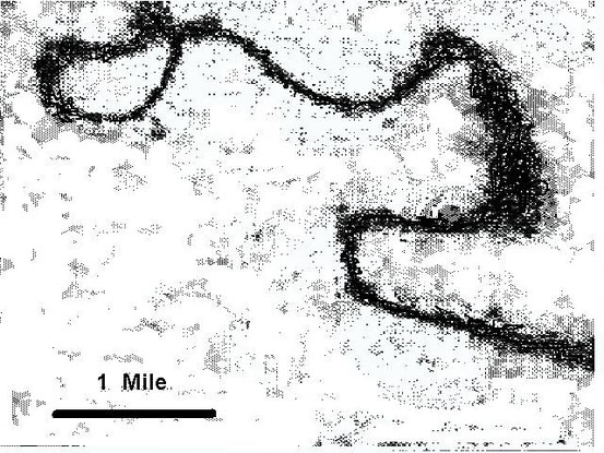 In den letzten Jahren wurden dreidimensionale seismische Daten zur Suche nach Öl verwendet. Dabei wurden viele interessante geologische Strukturen gefunden, wenn sie an der Grenze zu einem Reflektor angezeigt wurden. In der untenstehenden Abbildung sehen Sie ein Flußbett, das in einer Tiefe von 1670 Fuß unterhalb der Prärie in Texas in Baylor Co. eingebettet ist. Falls alle geologischen Schichten während einer globalen Flut eingebettet wurden, kann es sich nicht um ein Flußbett eines vorsintflutlichen Flusses handeln, weil unter diesem weitere 5000 Fuß Sedimentschichten liegen. Im Bild ist die weiße Fläche Kalkstein, in welchen der Fluß sein Bett erodierte (dunkel). Ölbohrungen, die außerhalb des Flußbetts niedergebracht wurden, zeigen Kalkstein in dieser Tiefe, aber Bohrungen in das Flußbett ergeben keinen Kalkstein an dieser Stelle sondern Sand und Sedimente, die vom Fluß abgelagert wurden. Die Erosion dieses Kalksteins benötigt viel mehr Zeit als sie die Anhänger einer jungen Erde zugestehen. (Original in AAPG Explorer, Juni 1993, S. 14)
