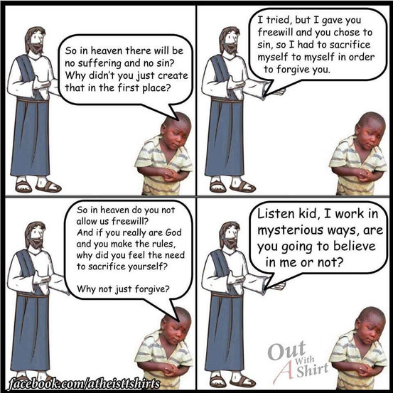 absurde Umwege (Jemand muss seinen unschuldigen Sohn einen Foltertod sterben lassen, damit andere von ihrer Schuld befreit sind?) einfach so die Sünden vergeben können. Wenn Gott aber