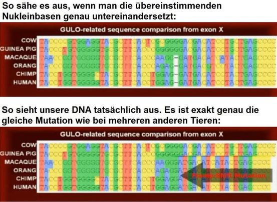 Genetische Vergleiche sind der stärkste Beweis für die Verwandtschaft unter den Arten. Hier werden nicht nur anatomische Ähnlichkeiten verglichen, sondern der tatsächliche Bauplan, der von einer Generation an die nächste vererbt wird. Gerichtliche Verwandtschaftsnachweise oder die forensische Spurensuche der Polizei beruhen auf genetischen Vergleichen. Das inaktive GULO-Pseudo-Gen beweist über jeden Zweifel unsere Abstammung von primitiveren Tieren.