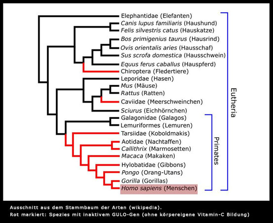Die Zellen unserer evolutionären Vorfahren (und der meisten heute lebenden Tiere) können Vitamin C selbst bilden. Dafür benutzen sie ein Enzym namens L-Gulonolactonoxidase (GULO). Dieses Enzym ist genetisch codiert. Durch spontane Mutationen ist es beim Menschen und allen anderen Trockennasen-Affen funktionslos geworden. Dennoch lässt sich das defekte, funktionslose Pseudo-Gen (der Bauplan für dieses Enzym) beim Menschen immer noch in jeder einzelnen Körper-Zelle auf Chromosom 8 nachweisen.
