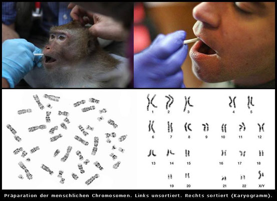 Die gesamte Erbinformation eines Menschen ist in jeder seiner Körperzellen in langen, dünnen DNA-Ketten gespeichert. Diese DNA-Ketten wickeln sich auf und bilden spiralige, dichte Gebilde - die Chromosomen. Chromosomen im Zellkern kann man unter dem Mikroskop sehen und isolieren. Alle Spezies der Menschenaffen haben 48 Chromosomen (24 Paare) - mit Ausnahme der Menschen, die haben nur 46 (23 Paare). Wie kommt das? Haben Menschen ein Chromosomenpaar verloren? Der Verlust von so viel Erbinformation innerhalb weniger Generationen wäre doch tödlich?