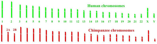 Oben: Chromosom 2a und Chromosom 2b des Schimpansen. Unten: fusioniertes Chromosom 2 des Menschen. Bei Anfärben entsteht dasselbe Bandenmuster. Die Chromosomen enthalten die gleichen Gene in der gleichen Reihenfolge in nahezu gleicher "Buchstabierung" (Basensequenz).