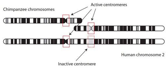 Mehr noch: Chromosomen haben einen unverwechselbaren Abschnitt in der Mitte (ein Mittelstück, Centromer) und jeweils an jedem Ende (zwei Endstücke, Telomere). Würde man zwei Chromosomen Ende-zu-Ende zusammenkleben, hätte das geklebte Chromosom plötzlich zwei Centromere - und End-Telomere an nicht vorgesehener Stelle - in der Mitte des Chromosoms. Genau diese Auffälligkeit zeigt unser Chromosom Nr.2