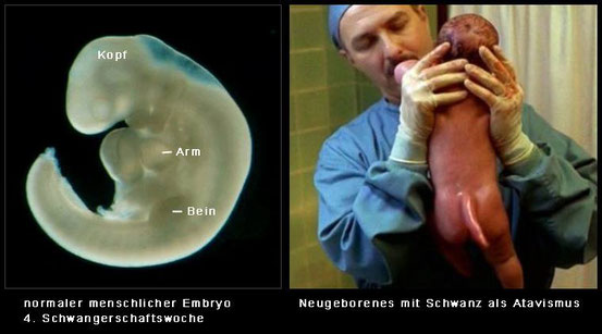 Während der Embryonalentwicklung zeichnen wir unsere Evolutionsgeschichte im Schnelldurchlauf nach. Von unseren evolutionären Vorfahren haben wir die Anlage für einen Schwanz geerbt. In der vierten Woche nach Befruchtung bilden alle humanen Embryos zusätzliche Wirbelanlagen über das Steißbein hinaus. Dieser Schwanz macht dann ungefähr ein Sechstel der gesamten Körperlänge aus (linkes Bild). In der 6. bis 12. Schwangerschaftswoche bildet sich dieser Schwanz zurück. Die Zellen der Wirbel gehen unter (Apoptose) und werden von weißen Blutkörperchen wieder abgebaut. Der Prozess wird in allen Wirbeltieren durch die Gene CDX1 und WNT-3a reguliert. Bei Menschen und anderen Primaten-Affen ist deren Aktivität down-reguliert.