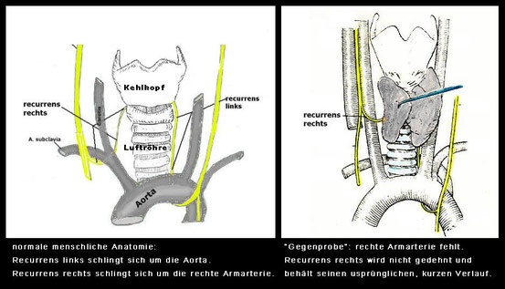 Die "Gegenprobe": Bei manchen Menschen fehlt die rechte Arteria subclavia, die embryonal den rechten Kehlkopfnerven in Richtung Brustkorb dehnt und verlängert. Damit behält der Nerv seinen ursprünglichen, direkten, kurzen Verlauf. (Der rechte Arm wird stattdessen über eine Arterie von der linken Seite versorgt (A. lusoria).