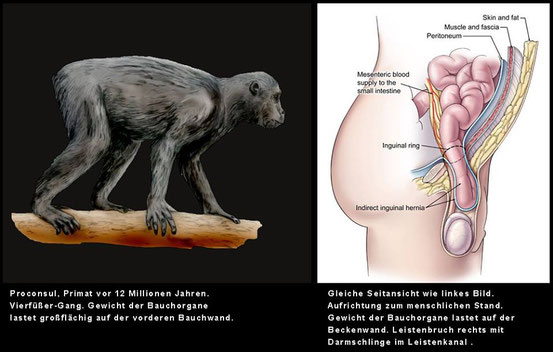 Unsere Vorfahren liefen bis vor sechs Millionen Jahren vierfüßig auf Armen und Beinen. Dabei lastet das Gewicht der Bauchorgane großflächig auf der Innenseite der Bauchwand. Die bietet ein