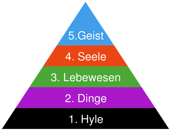 Schichtenlehre des Aristoteles – Zum besseren Verständnis des Begriffs „Hyle“ (= Materie, Körper) siehe die aristotelische Lehre des Hylozoismus. Die Spitze der Pyramide stellt im Zusammenhang der Lehre von Descartes die „unausgedehnte“ res cogitans (Denken) dar, die Basis die „räumlich ausgedehnte“ res extensa (Körper).