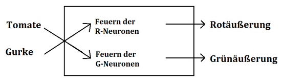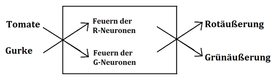 Was folgt aus dieser Tatsache für die Intuition der Möglichkeit vertauschter Qualia? Alle realistischen Überlegungen zur Qualia-Inversion gehen, so Dennett, von der Frage aus, unter welchen Bedingungen es wohl in derselben Person zu einer Vertauschung von, sagen wir, Farbeindrücken kommt, die von der Person selbst festgestellt werden kann.[5] Eine erste Antwort auf diese Frage liegt auf der Hand. Man muss die Neuronen im Gehirn einer Person S so neu "verdrahten", dass alles, was bisher zum Feuern von R-Neuronen führte (d.h. zu Feuern der Neuronen, die mit Roteindrücken verbunden sind), in Zukunft zum Feuern von G-Neuronen führt und umgekehrt. Denn dies scheint mit ziemlicher Sicherheit dazu zu führen, dass nach der Neuverdrahtung Feuerwehrautos für S grün aussehen, während ihr frische Buchenblätter rot erscheinen. Und es scheint auch sicher, dass S diese Vertauschung der normalen Farbeindrücke bemerken wird, da sich ihre Reaktionen auf das Feuern von R- bzw. G-Neuronen nicht verändert haben.