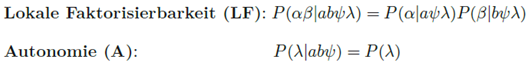 Die Faktorisierbarkeitsbedingung formalisiert die Tatsache, dass in der gegebenen Struktur jedes der Messergebnisse direkt nur von seiner je lokalen Messeinstellung, vom Quantenzustand und den verborgenen Parametern beeinflusst wird, nicht aber vom anderen Messergebnis oder der entfernten Messeinstellung. Die Autonomiebedingung hingegen resultiert aus der Tatsache, dass es keine Einflüsse zwischen der Variablen λ einerseits und den Messeinstellungen und dem Quantenzustand ψ andererseits gibt.