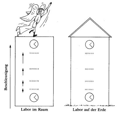 Auf der rechten Seite steht ein Labor auf der Erde, auf die beiden Uhren im Labor wirkt die Gravitation. Auf der linken Seite wird ein anderes Labor im Weltraum (durch eines der dort lebenden Engelchen) beschleunigt. Nach der ART sind beide Situationen gleichwertig, da man im Inneren des Labors nicht ermitteln kann, ob man in Richtung Boden gezogen wird, weil die Gravitation der Erde wirkt, oder weil das Labor im freien Raum beschleunigt wird.