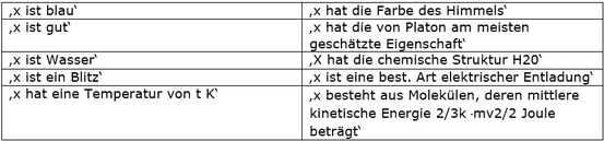 Was Frege mit Eigennamen und Bezugsobjekten gemacht hat, lässt sich für unsere Zwecke auch auf Prädikate und Eigenschaft anwenden. In der folgenden Tabelle stehen links und rechts jeweils Prädikate, die dieselbe Eigenschaft ausdrücken, die aber nicht bedeutungsgleich sind: