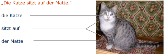 i. Semantische Bedingung: Die Teilelemente eines Satzes stehen für entsprechende Teilelemente der Tatsachen "Die Katze sitzt auf der Matte."