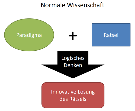 Dies schränkt ihr Forschungsfeld zwar drastisch ein, ermöglicht ihnen jedoch eine Tiefe und Genauigkeit in der Forschung, wie sie ohne das Paradigma unvorstellbar wäre. (ebd.) Damit Normalwissenschaft also überhaupt funktionieren kann, muss ein Forscher dem Paradigma, in dem er arbeitet, in gewisser Weise unkritisch gegenüberstehen. Nur so ist er in der Lage, seine Kräfte auf die ausführliche Ausarbeitung des Paradigmas zu konzentrieren.