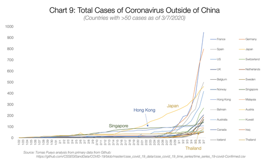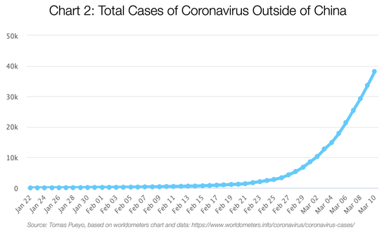 Die nächste Grafik zeigt die Zahl der bestätigten Coronavirus-Infektionen außerhalb Chinas.