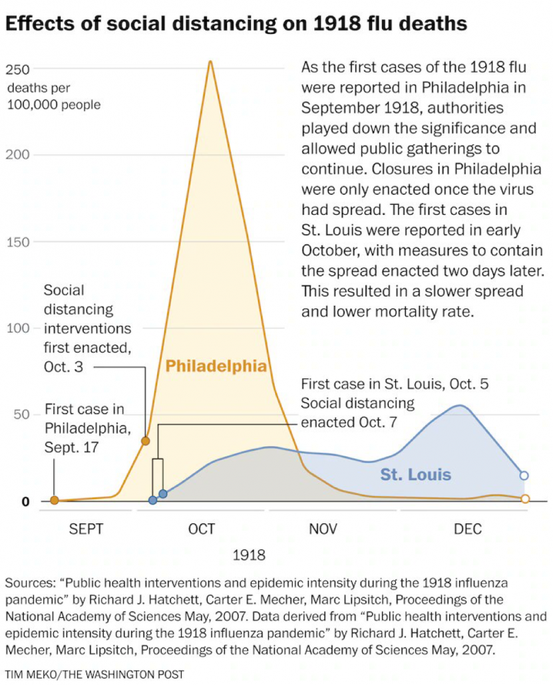 Das sind alles weder neue Erkenntnisse noch graue Theorie, wie die Erfahrungen mit der Spanischen Grippe vor gut 100 Jahren zeigen. Am 17. September 1918 trat der erste Fall in Philadelphia auf. Die Stadt wartete jedoch bis zum 3. Oktober, also mehr als 2 Wochen, bis sie entschiedene Maßnahmen ergriff. Das Resultat war ein Massensterben, das den gesamten Oktober anhielt. St. Louis hatte von diesem Fehler gelernt. Dort wurde der erste Fall am 5. Oktober diagnostiziert und die Stadt reagierte bereits 2 Tage später beherzt, was den Epidemieverlauf dort massiv entschärfte.
