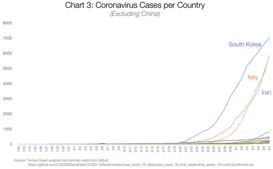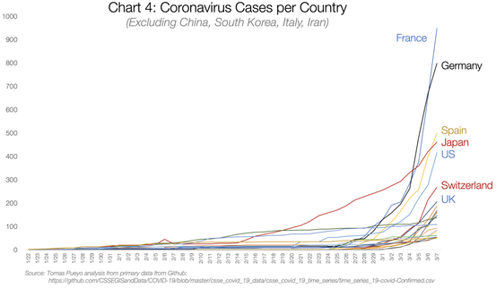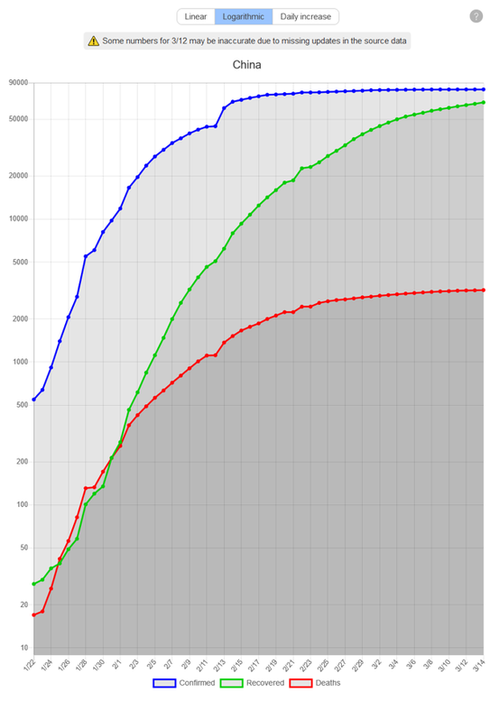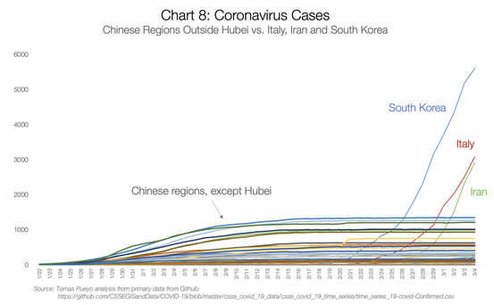 Im Vergleich dazu sieht man die Entwicklung in Südkorea, Italien und Iran, die einen ganzen Monat Zeit hatten, von den Erfahrungen Chinas zu lernen, aber diese Chance verstreichen ließen. Ende Februar geriet die Lage in diesen 3 Ländern außer Kontrolle und ihre Fallzahlen überstiegen diejenigen aller chinesischen Regionen außer Hubei.
