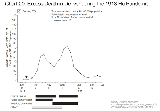 Denver beschloss Anfang Oktober 1918 strikte Maßnahmen, welche die Epidemie erfolgreich eindämmten. Nach einem Peak Mitte Oktober fielen die Sterberaten deutlich. Dies veranlasste Denver, die Maßnahmen Mitte November wieder zu lockern, was aber zu einem erneuten Aufflammen der Krankheit und einem Massensterben im Dezember führte – diesmal sogar noch schlimmer als beim Peak im Oktober.