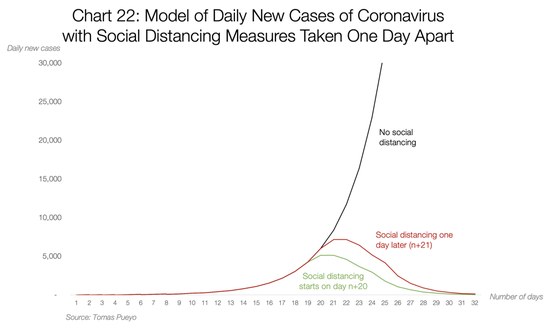 Jeder Tag, um den Social-Distancing-Maßnahmen hinausgezögert werden, kann 25 bis 40 % mehr Infizierte bringen.