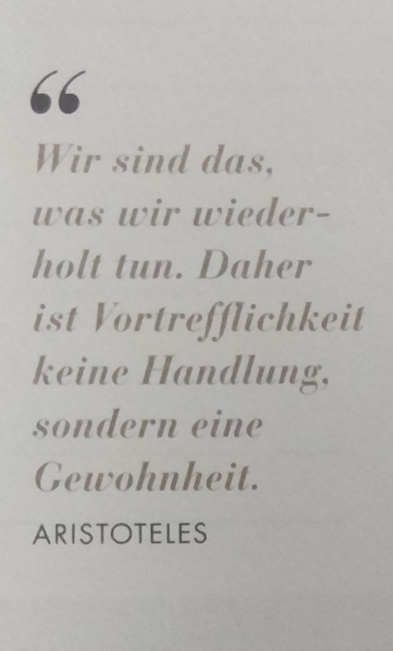 Meine Gegenthese wäre: Wir sind das, als was wir dauerhaft angesehen werden. Daher ist Vortrefflichkeit weder Handlung noch Gewohnheit, sondern das, was uns vor allem Handeln und Gewohntsein von