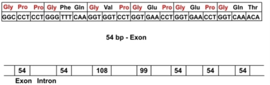 Abbildung 5: Ausschnitt aus dem Gen, welches für das Kollagen kodiert. Oben ist ein Exon abgebildet, welches aus 54 Basenpaaren (bp) besteht. Darin sticht die 9-bp-Grundsequenz hervor, die für die drei Aminosäuren „Glycin- Prolin-Prolin“ kodiert. Dieses tritt in vielfältiger Variation mehrmals in Erscheinung. Das Gen besteht als Ganzes wiederum aus zahlreichen solcher 54-bp-Exons oder Vielfachen davon – ein klarer Hinweis auf seinen evolutionären Ursprung durch zahlreiche Tandem-Duplikationen in der Vergangenheit.
