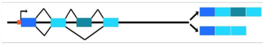 Abbildung: Alternatives Splicing. Die blauen Kästen symbolisieren Exons, das orangefarbene Kästchen den Transkriptionsstartpunkt und die Bereiche zwischen den Exons sind Introns. Bei der Transkription (dem Umschreiben der DNA zur RNA) wird zunächst der gesamte Bereich zwischen Transkriptionsstart- und Endpunkt in prä-RNA umgeschrieben. Aus dieser prä-RNA werden die Introns ausgeschnitten, so dass die Exons direkt aufeinander folgen (d. h. die Exons werden zusammen „gespleißt“). Die resultierende RNA wird dann als Boten- oder Messenger-RNA (mRNA) bezeichnet und erst dann in eine Aminosäuresequenz/Protein translatiert („übersetzt“). Beim alternativen Splicing können aus einer prä-RNA verschiedene mRNAs und damit auch verschiedene Proteine entstehen, indem z. B. wie im Bild ein Exon (der dritte Kasten von links) entweder in die entstehenden mRNA mit eingeht (rechts oben) oder nicht (rechts unten).