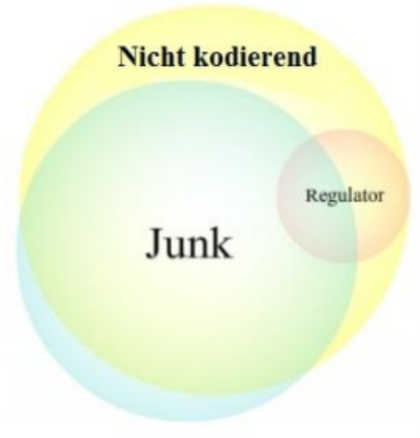- Dann gibt es DNA-Bereiche, die ohne jede Folge frei mutieren oder deletiert werden können. Das wäre Junk-DNA und darüber hinaus funktionsloser Junk, also DNA-Müll im engeren Sinne. Das bedeutet aber nicht, dass diese Bereiche keinerlei Aktivität zeigen: Sie können sehr wohl zu nutzloser RNA transkribiert werden. Und damit können sie in der späteren phylogenetischen Historie eine Funktion annehmen.