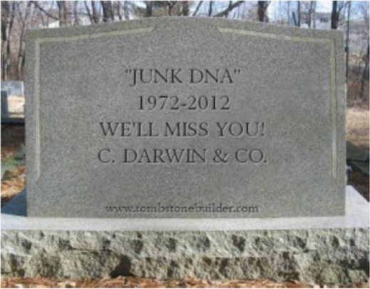 Vor einigen Monaten geisterten Nachrichten durch die Presse, die plötzlich alles infrage stellten. In zahlreichen populären Darstellungen heißt es, die Existenz von „Junk-DNA“ sei im Rahmen neuer Studien als Mythos entlarvt worden. Diese DNA sei, entgegen der Meinung der Evolutionsbiologie, keineswegs funktionsloser Müll, denn 80% der DNA erfülle „wichtige Aufgaben“ (ENCODE 2012; DE SOUZA 2012; QU/FANG 2013). Dies hat vor allem im Lager der Schöpfungsanhänger wahre Begeisterungsstürme ausgelöst und zu der überzogenen Behauptung geführt, das Junk-DNA-Konzept gehöre nun der Geschichte an (z.B. LUSKIN 2012; TYLER 2012; WORT UND WISSEN 2012). Solchen Behauptungen verleiht TYLER (2012) durch einen eigens illustrierten Grabstein Nachdruck (Abb. 6).
