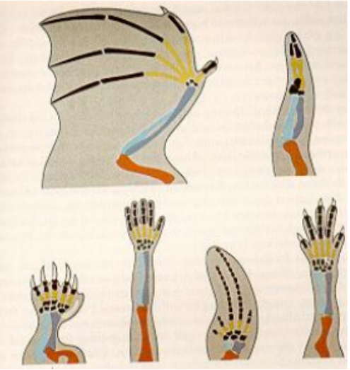 Abbildung: Ähnlichkeiten im Skelettbau der Extremitäten von Vierfüßern. Von oben nach unten und von links nach rechts: Fledermaus, Vogel, Maulwurf, Mensch, Wal und Eidechse. Trotz unterschiedlichster funktioneller Beanspruchung ist der Feinbau der Skelette identisch. Rot: Oberarmknochen, blau: Elle und Speiche, gelb: Mittelhandknochen, schwarz: Handwurzelknochen und Fingerknochen (Phalangen).