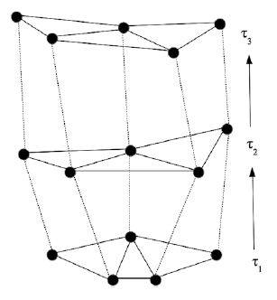 Abbildung 1: Abfolge sich verändernder Abstandsrelationen zwischen einer festen Anzahl (Konfiguration) von Punktteilchen mit einer objektiven Ordnung 𝜏 dieser Abfolge. Diese Abbildung ist aber in der Hinsicht irreführend, dass sie die Veränderung als diskret statt kontinuierlich darstellt.