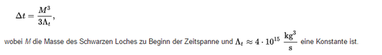 Da nach Hawking ein Schwarzes Loch stetig Energie in Form von Hawking-Strahlung verliert, wird es nach einer bestimmten Zeitspanne dt vollständig zerstrahlt sein, sofern es während dieser Zeitspanne keine neue Masse aufnehmen kann. Diese Zeitspanne berechnet sich durch