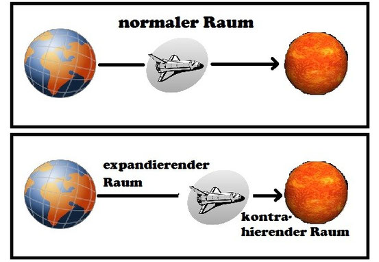 Mit einer gewissen Vorsicht kann man das Ganze mit einem galaktischen Shushiförderband vergleichen. Ihre Masse (Gewicht) steigt gegen Unendlich an, wenn Sie sich der Lichtgeschwindigkeit von rund 300.000 km/ s nähern. Sie wollen aber unbedingt dieses Sushi dort drüben essen, das eintausend Lichtjahre von Ihnen entfernt auf dem Band liegt. Sie können sich nicht selbst auf dem Weg zum Sushi machen, da dies über eintausend Jahre dauern würde und sie in der Zwischenzeit am Hunger oder am Alter sterben würden. Was Sie aber können ist das Förderband in Bewegung versetzen, sodass die Bandlänger zwischen ihnen und ihrem Sushi weniger wird. So haben Sie sich ohne Eigenbewegung näher an Ihren Zielort bewegt.
