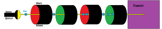 Schemenhaft ist oben die Funktionsweise eines Linearbeschleunigers dargestellt. Zu Beginn schießt eine Ionenquelle einen Strahl von Ionen durch sogenannte Driftröhren.