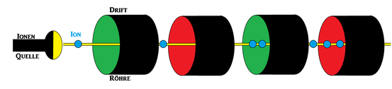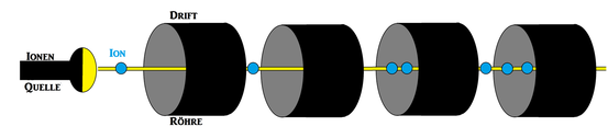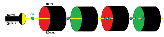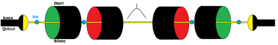 An den Driftröhren wird nun eine Wechselspannung angelegt, und zwar so, dass sie jeweils nacheinander positiv und negativ geschalten sind. Verfolgen wir nun die Reise eines Ions. Das Ion kommt zunächst aus der Quelle und wird als negativ geladenes Elektron sofort von der ersten, positiv geladenen Driftröhre angezogen.