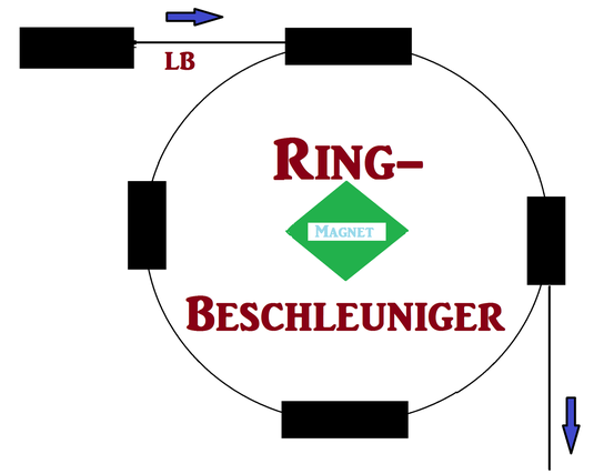 Eine Modifikation braucht es dennoch: Teilchen lassen sich nicht um die Ecke beschleunigen, daher installieren wir mehrere Ablenkmagnete in der Mitte des Beschleunigers, die die Teilchen auf der runden Bahn halten. Diese Magnete müssen ungeheuer stark sein, da die Teilchengeschwindigkeit nah an die Lichtgeschwindigkeit herankommt.