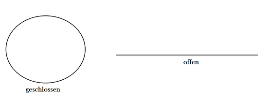 Strings können offen und geschlossen sein. Ein geschlossener String besitzt keine Endpunkte und ist daher topologisch äquivalent zu einem Kreis. Man kann ihn sich in Schleifenform vorstellen. Den offenen String kann man sich mithilfe seines Namensvetters im Englischen, der Saite, in Linienform vorstellen. Er ist topologisch zu einer Strecke.
