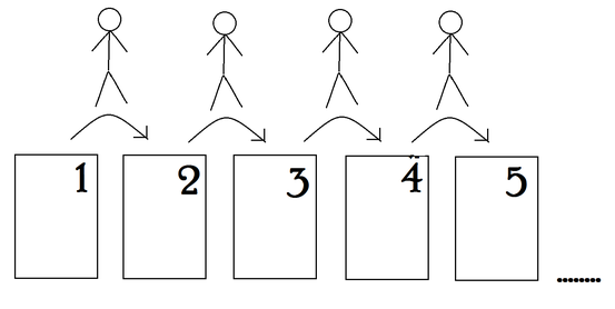 Gehen wir jetzt davon aus, dass Sie erneut unendlich viele Zimmer mit unendlich vielen Gästen bewirten. Aufgrund einer unglaublichen Attraktion in Hotelnähe kommen nun unendlich viele Gäste und wollen ein Zimmer bei Ihnen beziehen. Könnten Sie auch diese unterbringen? Ja. Jeder der Hoteleinwohner soll seine Zimmernummer verdoppeln und in das Zimmer mit der resultierenden Nummer wechseln. So geht der Gast von Zimmer 1 auf Zimmer 2, der Gast von Zimmer 2 auf Zimmer 4, der Gast von Zimmer 3 auf Zimmer 6 usw. Wenn ein Gast in Zimmer N war, ist er nun im Zimmer 2N und somit sind unendlich viele Zimmer mit ungerader Nummer für die unendlich vielen, neuen Gäste freigeworden.
