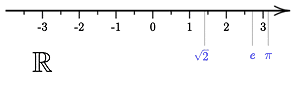 Alle reellen Zahlen liegen auf der Zahlengeraden bzw. die Summe aller Punkte auf der Zahlengeraden entspricht alle reellen Zahlen. Reelle Zahlen sind beispielsweise 2, -4, √8, π (Pi) usw.