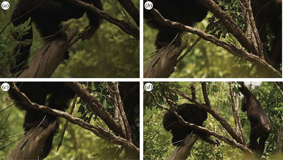 Jagd mit Hilfe eines Werkzeugs in Fongoli, Senegal. Ein erwachsener, männlicher Schimpanse stochert mit einem langen Zweig mit modifiziertem (spitzem) Endstück (a-c) in einer Höhlung am Ast eines Baumes, in der ein Galago sitzt. Schließlich erbeutet er das Tier (d), während sein jüngerer Bruder zuschaut.