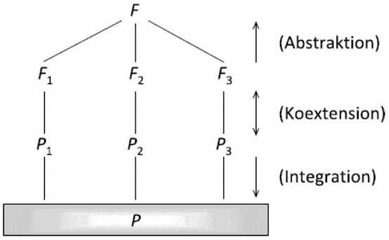1) Innerhalb einer fundamentalen und universellen physikalischen Theorie P bildet man die Begriffe P1, P2, P3 usw., welche die verschiedenen Konfigurationen von Vorkommnissen physikalischer Eigenschaften erfassen, die alle den gleichen funktionalen Typ F einer Einzelwissenschaft realisieren. Diese physikalischen Begriffe P1, P2, P3 usw. sind somit in die umfassende physikalische Theorie P integriert.