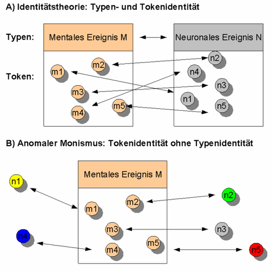 Bild: Klassische Identitätstheorie und anomaler Monismus im Vergleich, die Pfeile beschreiben Identität. Bei der Identitätstheorie gehören mentale und neuronale Token je einem Type an, die Types sind ebenfalls identisch. Beim anomalen Monismus sind die mentalen Ereignisse eines Types mit neuronalen Ereignissen verschiedener Typen identisch.