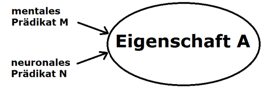 Die Identitätstheorie greift diesen Reduktionsgedanken auf und behauptet, dass M-Eigenschaften mit neuronalen Eigenschaften (kurz: N-Eigenschaften) identisch sind. Daraus folgt: Für jedes mentale Prädikat P(M) existiert prinzipiell ein neuronales Prädikat P(N), so dass P(M) und P(N) dieselbe Eigenschaft A bezeichnen.[6] Wie ist diese Identitätsbehauptung genauer zu verstehen?