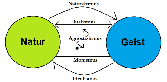 Einer der größten Fragen der Philosophie ist die nach dem Verhältnis zwischen Geist und Natur. Die Diskutanten dieses Themas lassen sich in die nun folgenden Weltbilder unterscheiden.